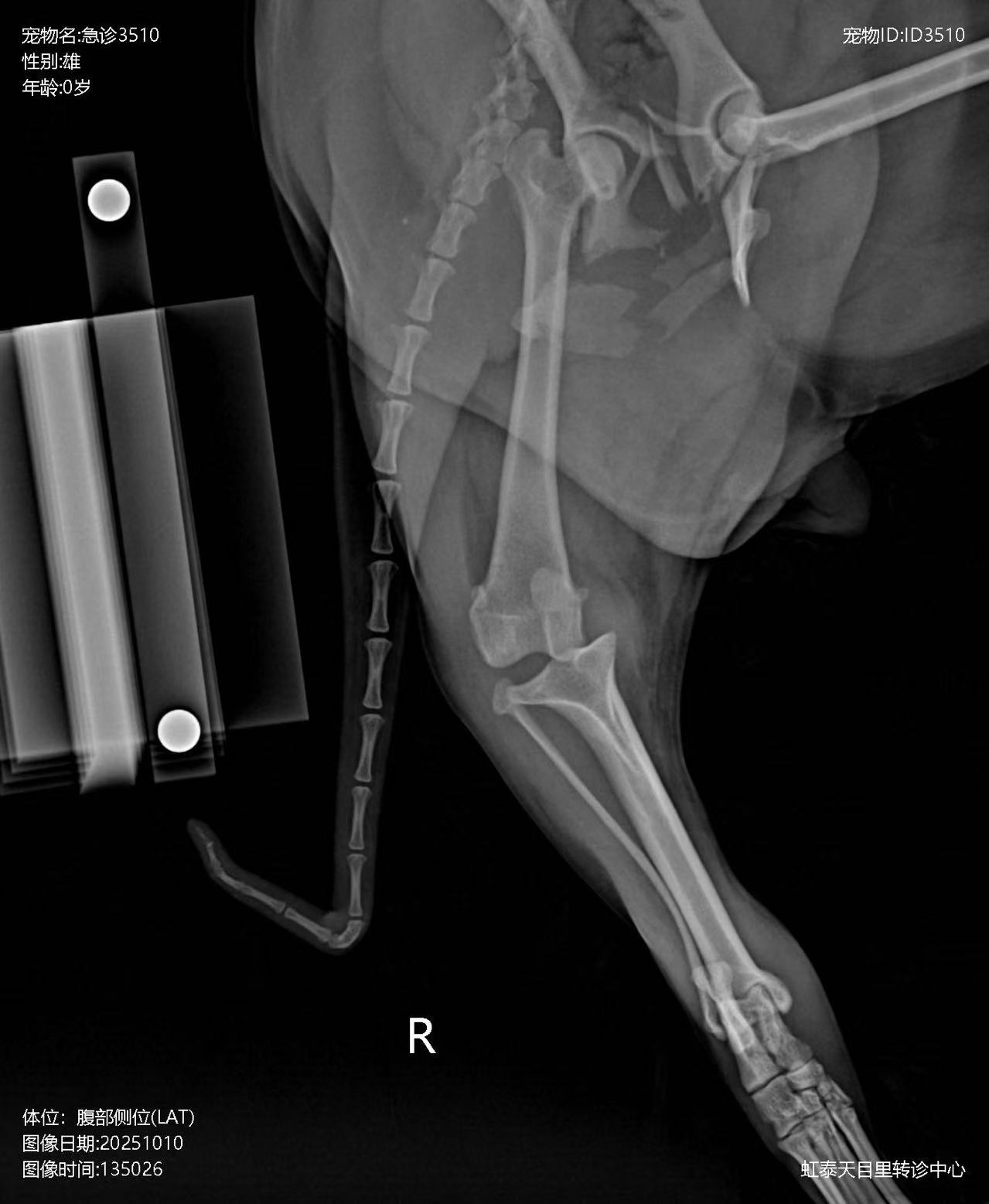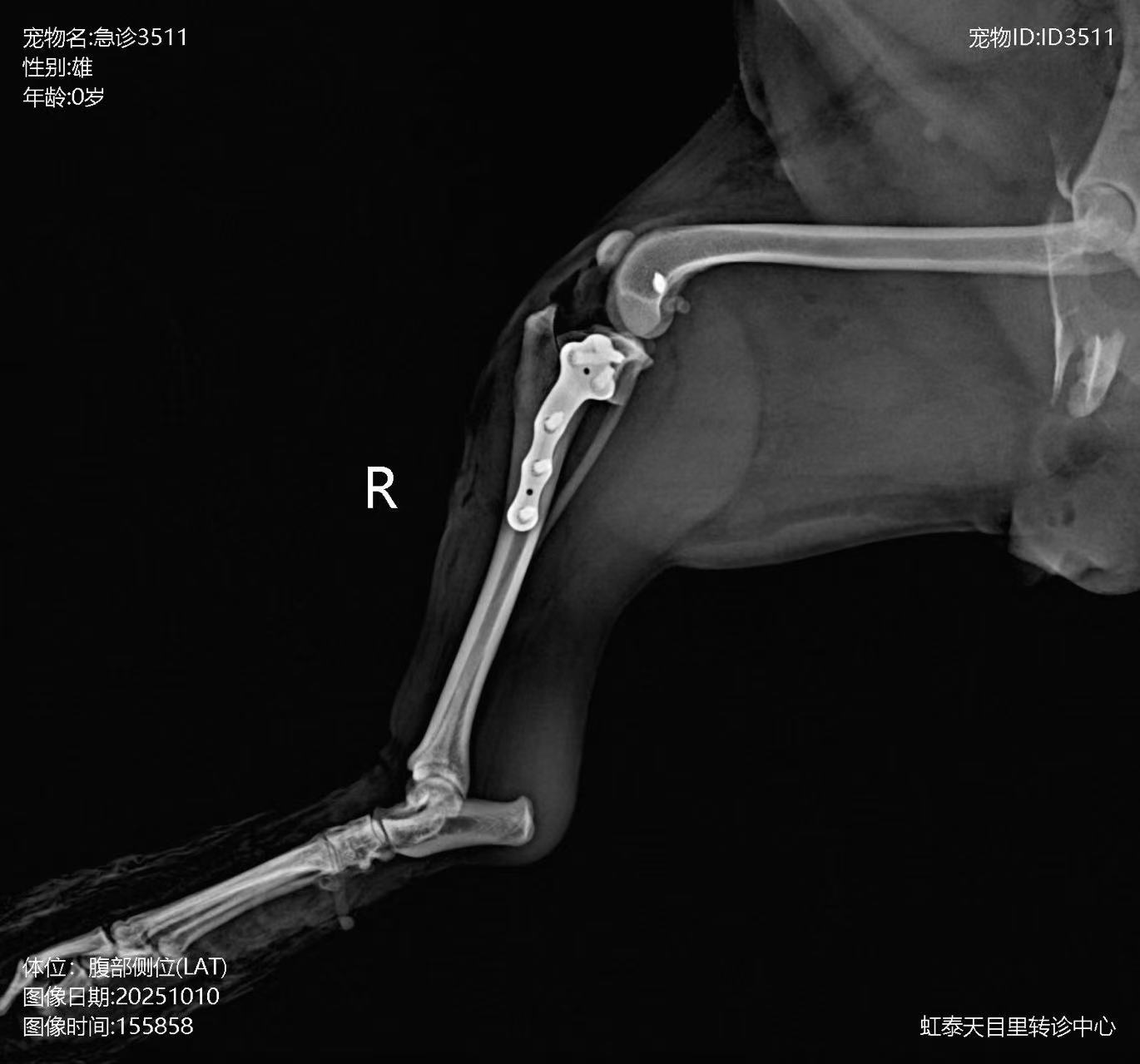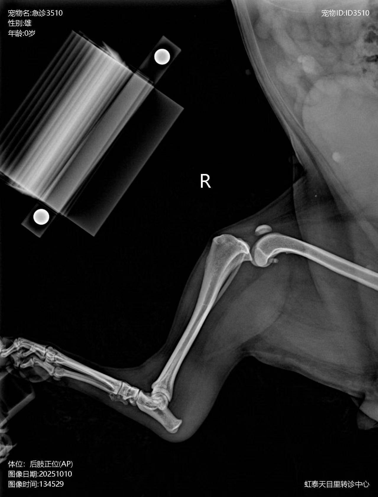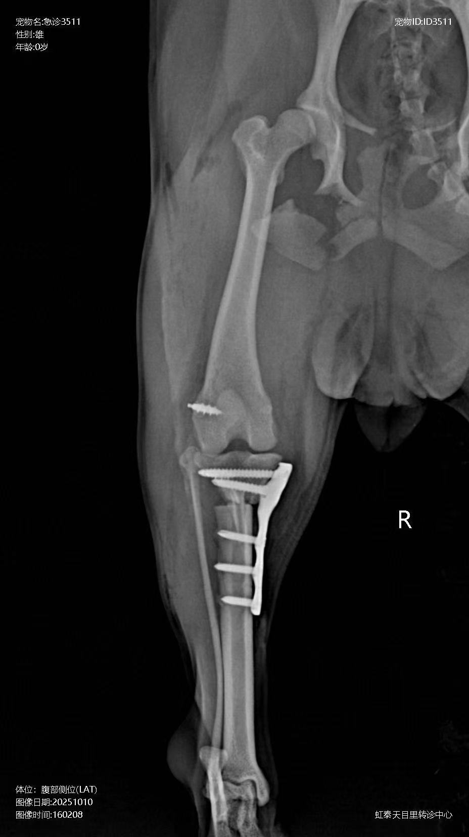 When an animal is involved in a car accident, high-energy trauma often results in multiple system and multi-site composite injuries. Among these, orthopedic injuries are the most common, including multiple fractures, ligament ruptures, dislocations, and varying degrees of soft tissue contusion and strain. After injury, the animal typically exhibits lameness and pain, severely affecting mobility and quality of life.